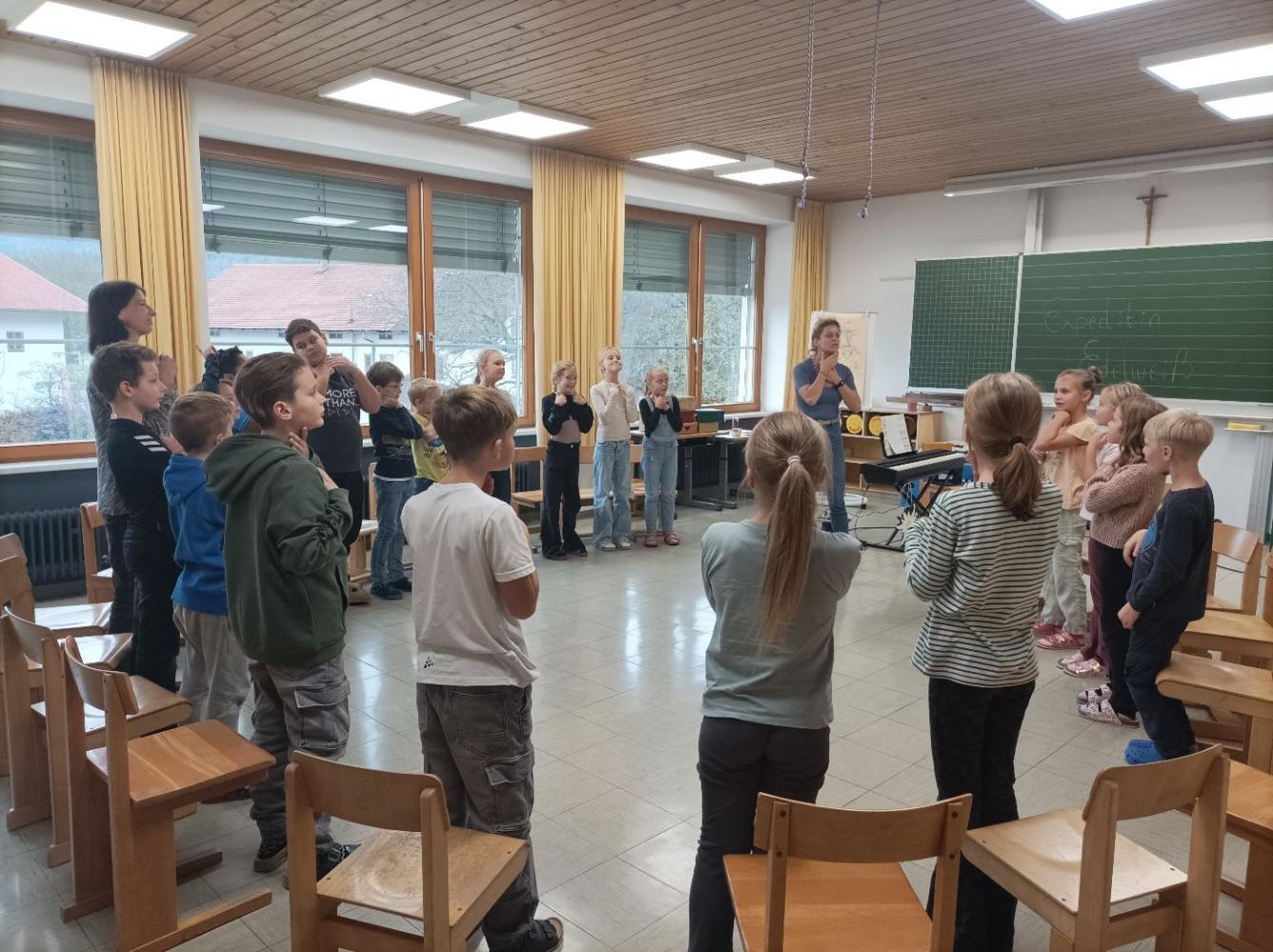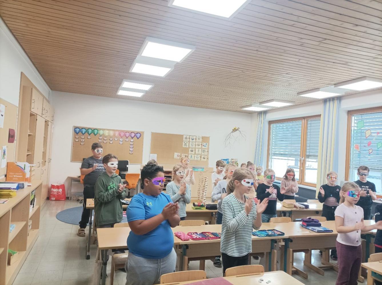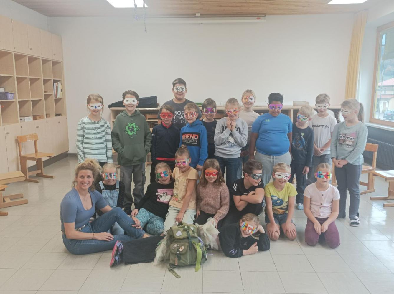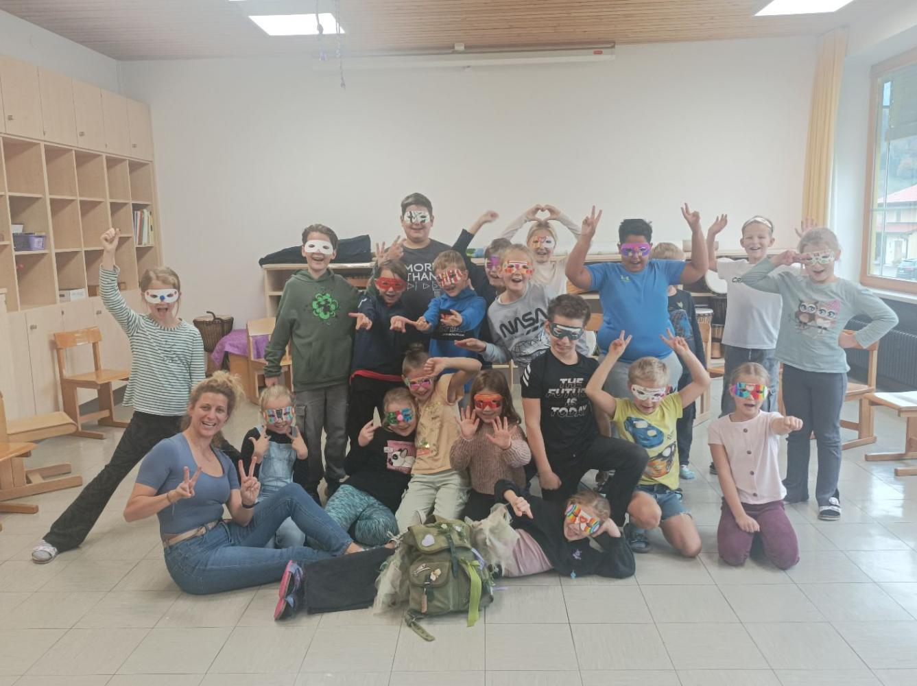 Wir, die Kinder der 3. Klasse, konnten ihren "Mitmach-Workshop" ausprobieren und wir waren sehr begeistert. Sie zeigte uns lustige Tanzbewegungen und auch das Mitsingen kam nicht zu kurz. Zum Schluss bastelten wir noch eine kreative Maske.